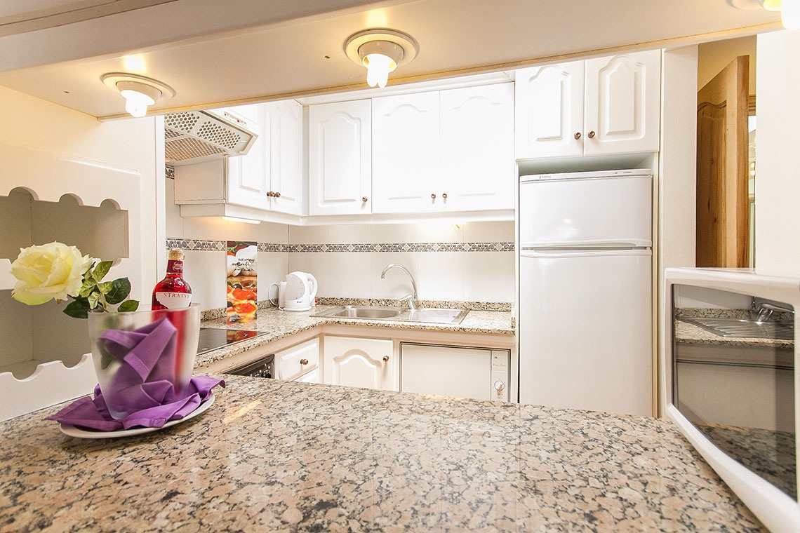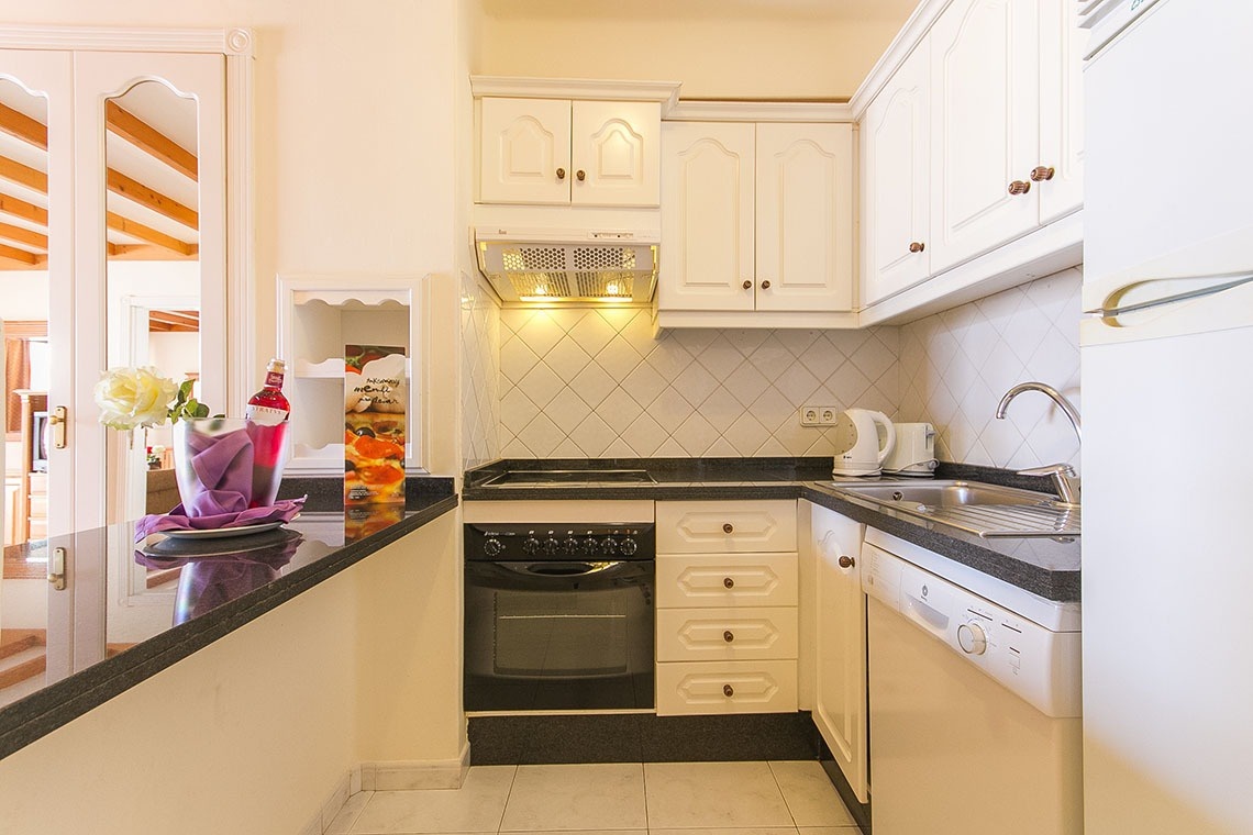 Cocina completamente equipada con horno, lavavajillas, tostadora, hervidor de agua, microondas y nevera con congelador